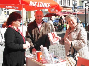 Mit Infoständen sind auch die Mitglieder der Bernsdorfer Basisgruppe der LINKEN in ihrer Stadt präsent. Unsere Landtagsabgeordnete Marion Junge  unterstützt in der ersten Maihälfte mit einer Kommunaltour die LINKE in Kamenz, Ohorn, Pulsnitz, Ottendorf-Okrilla und Hoyerswerda.